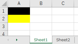 下記のコードではSheet1のA1をColorIndexプロパティを使用して黒に着色しA2をColorプロパティを使用して黄色に着色しています。