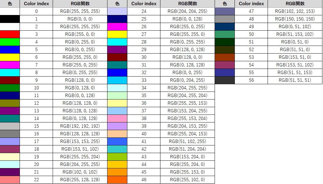 各色とColorIndexプロパティ、Colorプロパティに設定するRGB関数の対応は下記になります。