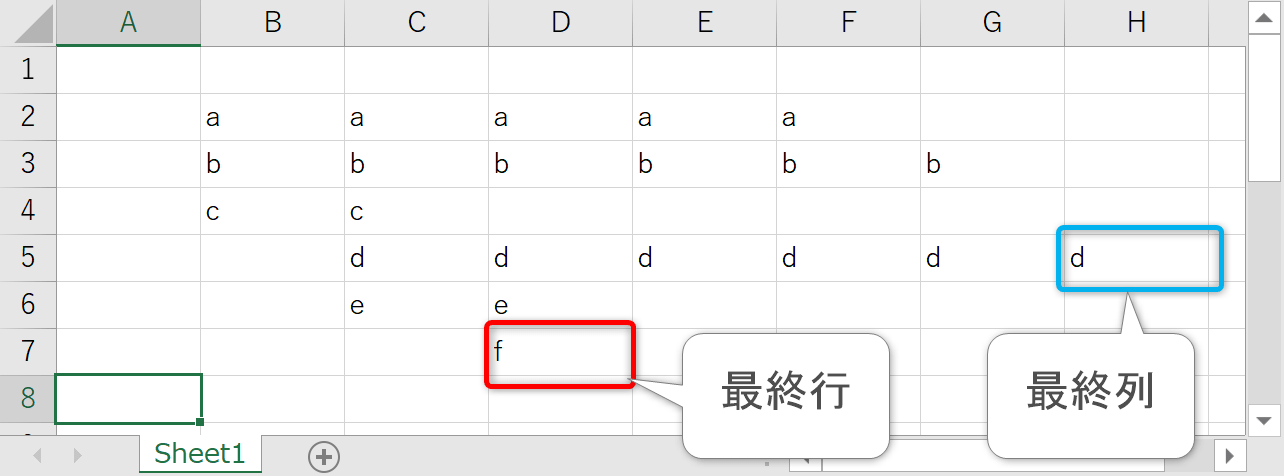 UsedRangeを使用して、シート上の最終行と最終列を取得するプロシージャを作成してみます。