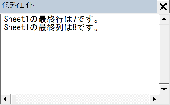 test_getLastRowColを実行すると、シート上の最終行と最終列をイミディエイトウィンドウに出力します。