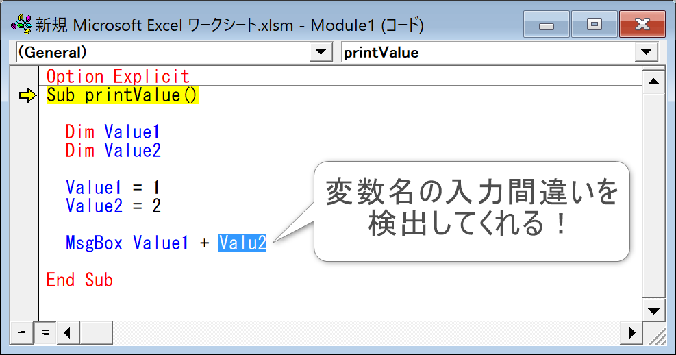 VBAではOption Explicitをモジュールの先頭に書くことにより、プログラムを実行する前に、