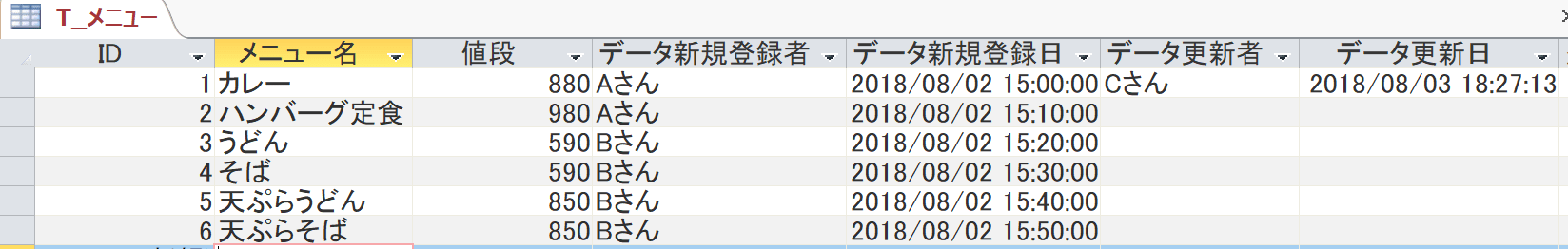 Accessにはテーブル「T_メニュー」があり、T_メニューにはメニューデータが記録されています。