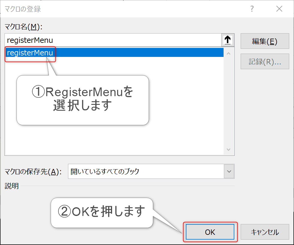 登録ボタンを押した時にregisterMenuプロシージャを呼び出すように設定します。