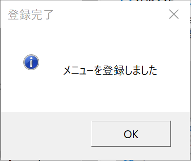 MsgBox "メニューを登録しました", vbInformation, "登録完了"